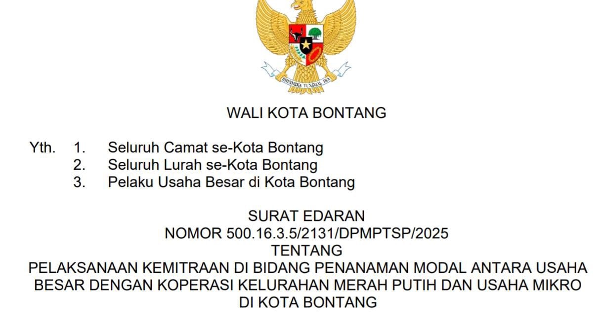 Surat Edaran Wali Kota Nomor 500.16.3.5/2131/DPMPTSP/2025 tentang Pelaksanaan Kemitraan di Bidang Penanaman Modal antara Usaha Besar dengan Koperasi Kelurahan Merah Putih dan Usaha Mikro di Kota Bontang (FOTO: Doc. DPMPTSP)