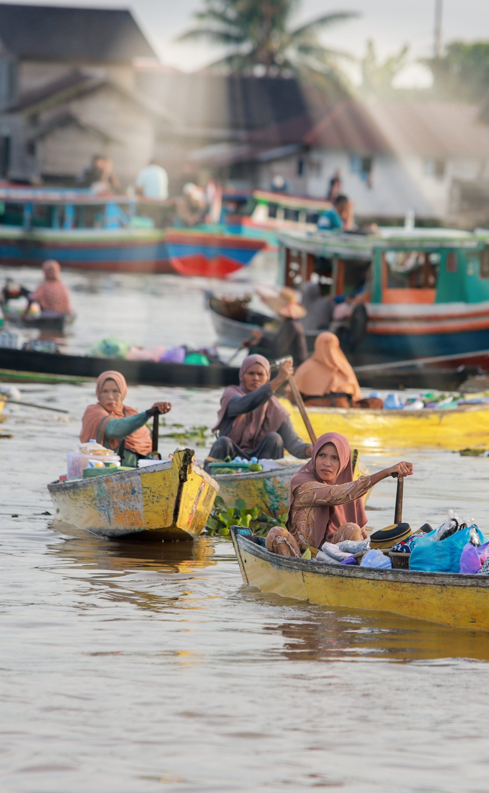 Para pedagang acil-acil tampak menjajakan dagangannya di atas perahu kecil yang bergoyang-goyang, Kamis (18/4) pagi di Pasar Terapung Lok Baintan, Kecamatan Sungai Tabuk, Kabupaten Banjar, Kalimantan Selatan. Tidak tergambar wajah kelelahan, mengeluh atau takut menghadapi hidup. Di atas air mereka berjibaku dengan semangat untuk memenuhi kebutuhan keluarga mereka.